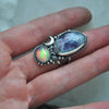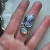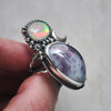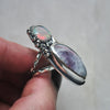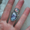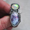 A precious opal, clear and yet filled with aurora borealis of light, is paired with a large piece of pink tourmaline and purple lepidolite in quartz. A large crescent moon and silver stars dance around like constellations while the entire piece rests on a split band. (the same band as the other Horizons ring possesses in the picture above)