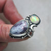 Made entirely out of Sterling Silver (.925), Fine Silver (.999). Given a dark patina with the front then given a highly polished finish on top and bottom. The stones are an all natural welo opal and the other is a piece of tourmaline and lepidolite included quartz.